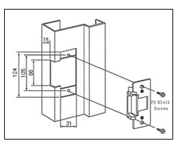 DES-301 (Doornics Electronic Strike) 제품특징정전시 열림/잠김형 겸용모니터링 기능 기본DC12V, DC24V 택일프레임에 설치되어 호환도어록(호텔용록)과 사용측압강도 1,100lbs (500Kg)ANSI Sized100만회 연속동작 Test124mm(L) x 31mm(W) x 30mm(D) 전기적 사양DC12V, DC24V (선택사양)정전압 전류 :DC12V @ 300mA ±10%DC24V @ 170mA ±10%배선: 적색 +, 흑색 – 전압/ 갈색 (공통), 노랑(NC), 파랑(NO)접점접점용량: Micro switch(From”C”) DC 30V 1A (MAX) Specifications Input Voltage DC12V, DC24V Current Draw DC12V300mA±10% , DC24V170mA ±10% Dimension 124mm(L)x31mm(W)x30mm(H) Monitoring Output Micro switch (From “C” ) DC30V 1A (MAX) Weight 380g 타공도 결선도